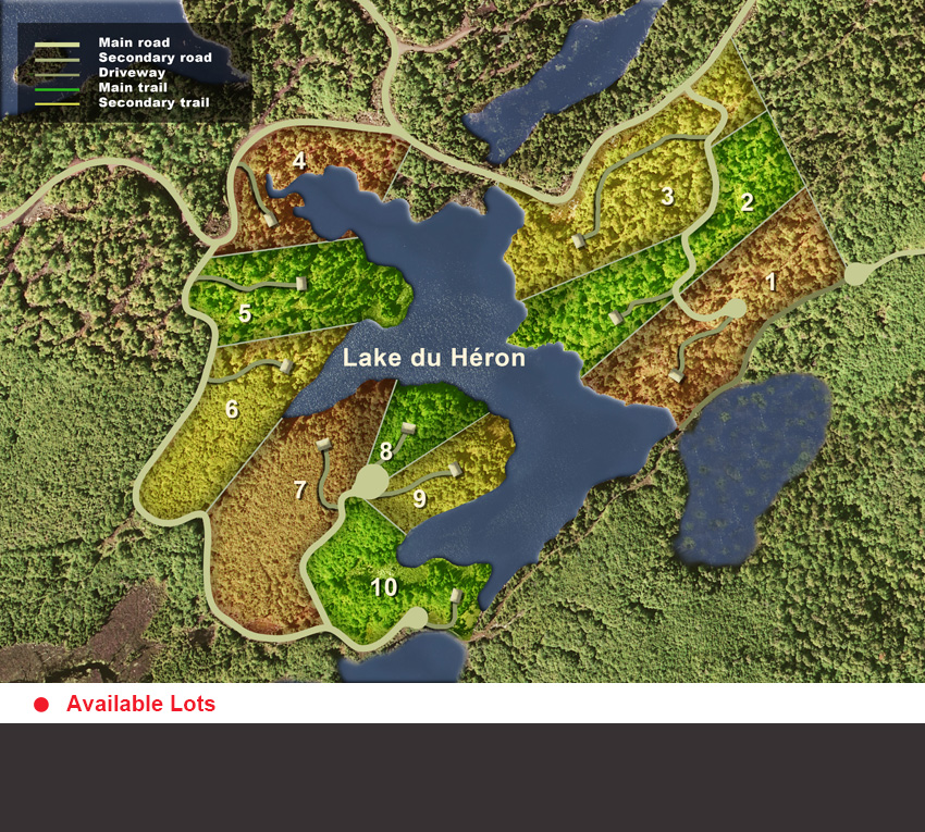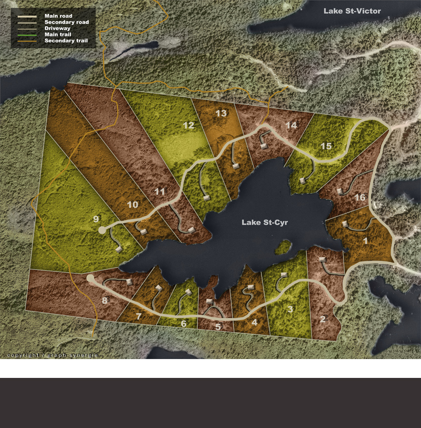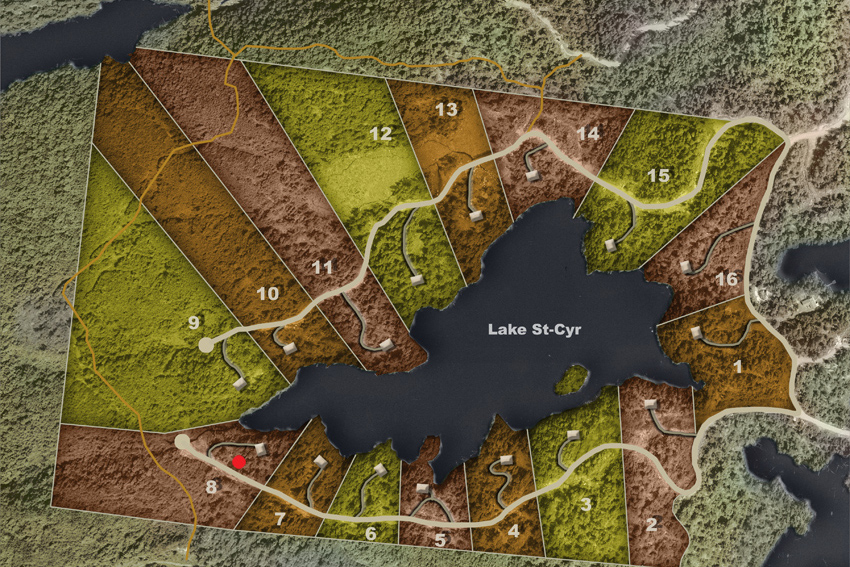 The concept of lake St-Cyr makes it even wilder and quieter since the lots are divided with a minimum of 153 lin.m. (500 lin.feet) of shoreline on the lake. For this reason their is only 16 lots (50 lots were planned originally by its previous owners).