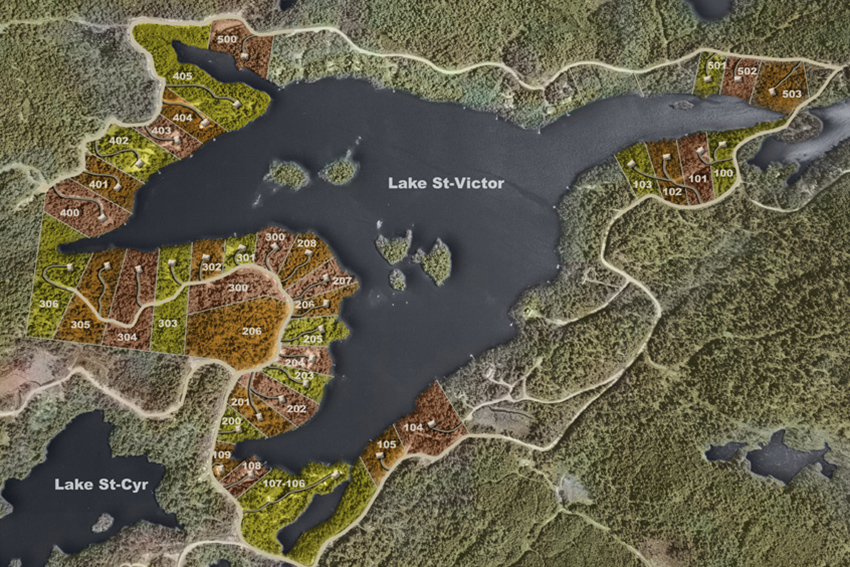 This lake is tributary of lake St-Victor and St-Cyr, and is situated south-west of the project on 140 acres (64 hectares) of land. Once again big lots are available. There are 10 lots.