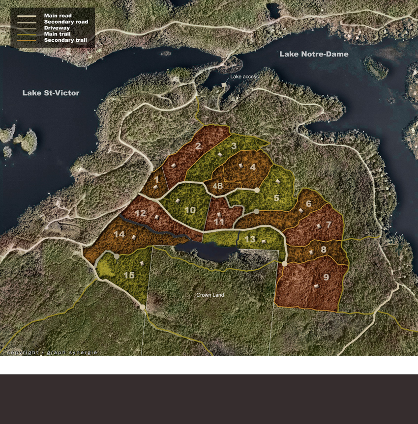 They are seperated by private trails that join up with Lake St-Victor’s extensive trail network. All the estates have a private access to water and have a dock at their disposition. The breath taking views look down over the wooded valleys and the blue water of the lakes below.