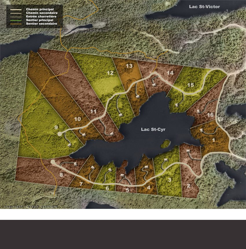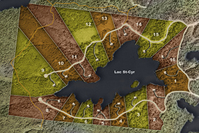 Le concept du lac St-Cyr est encore plus sauvage et privé puisque les propriétés ont été divisées avec un minimum de 153 mt.lin. (500 pi.lin.) en bordure du lac. Pour cette raison il n’y a que 16 terrains (50 terrains étaient prévus originalement par les anciens propriétaires).