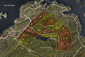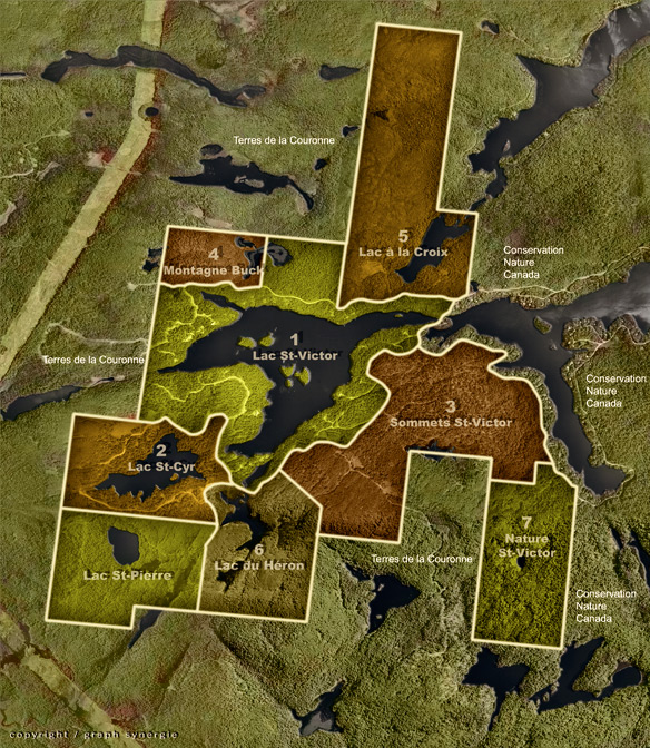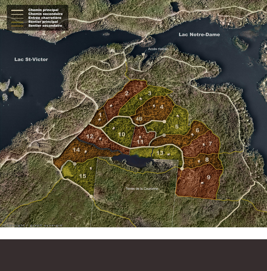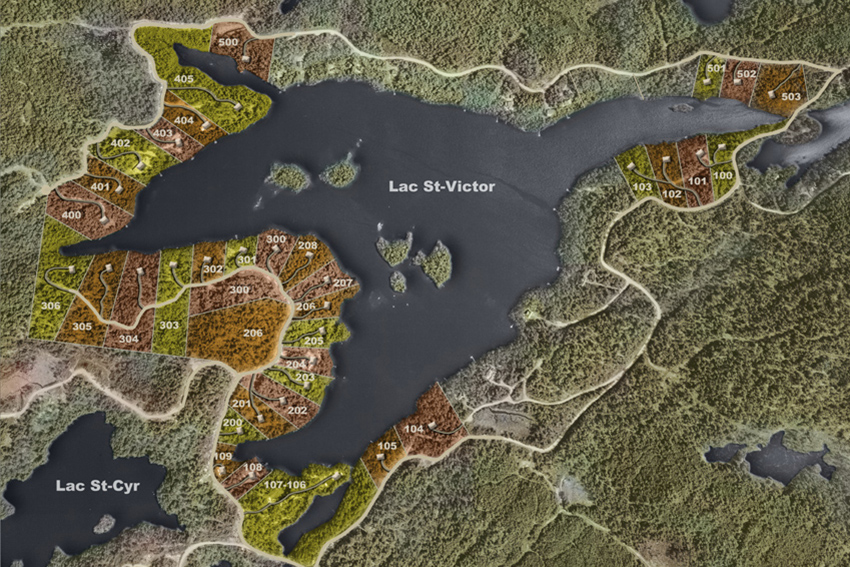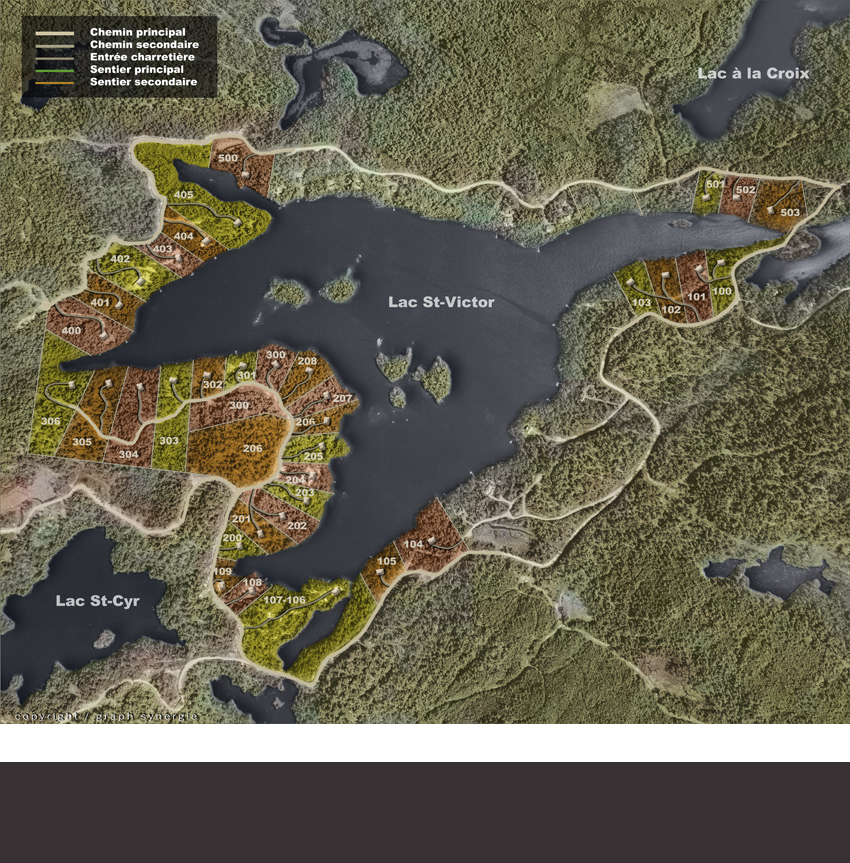 Les domaines sont séparés par des sentiers privés menants au grand réseau de sentiers du lac St-Victor. Tous les domaines ont un accès privé à l’eau avec un quai à leur disposition. Les vues sont imprenables surplombant les vallées de forêts et les lacs aux eaux bleutées.